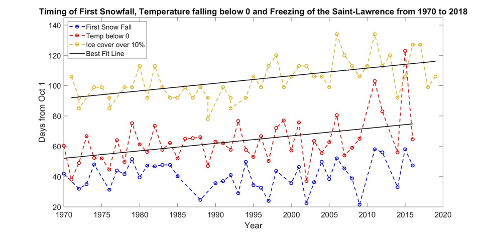 Winters have become milder since 1970. Average winter temperatures in the region have risen 0.28ºC per decade, and average and maximum ice extent in the St. Lawrence has declined by 1-3% per decade. However, total amount of snow and rain has not changed. Winters have also become shorter since 1970: on average each decade has seen 5 fewer days of below-0ºC temperatures, these freezing temperatures begin later in the year, and the amount of time the river is frozen has decreased by nearly 10 days per decade.